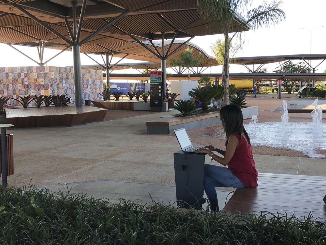 Uma praça com mesas de trabalho de ferro, bancos de descanso com tomada para carregar o celular e parquinho para crianças, rodeada por cafés, lanchonetes e restaurantes, tudo os sob ipês amarelos típicos de Brasília. Assim é o espaço de conveniência e mobilidade instalado no Aeroporto Internacional de Brasília, que tem vias exclusivas para carros chamados por aplicativo e para vans de locadoras e que, nos próximos meses, vai passar a abrigar marcas multinacionais como Starbucks e Dunkin’.