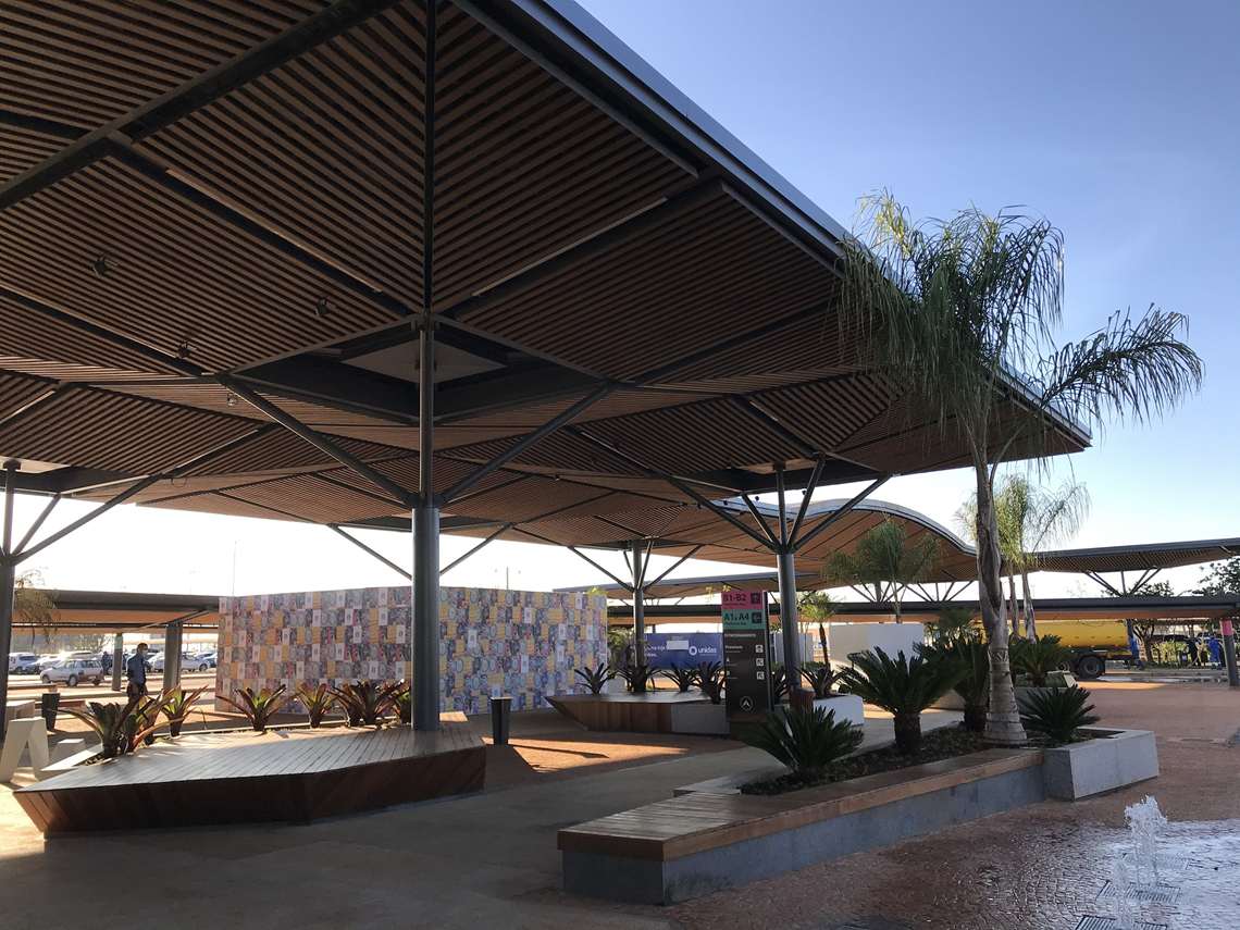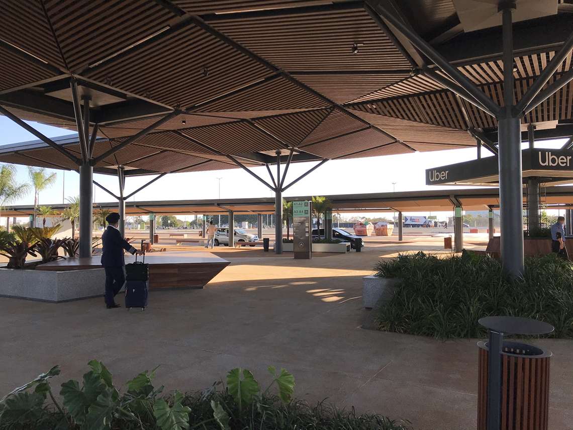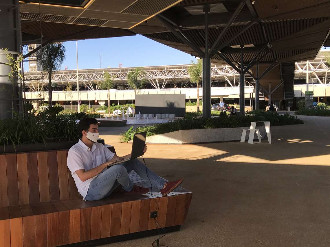 Uma praça com mesas de trabalho de ferro, bancos de descanso com tomada para carregar o celular e parquinho para crianças, rodeada por cafés, lanchonetes e restaurantes, tudo os sob ipês amarelos típicos de Brasília. Assim é o espaço de conveniência e mobilidade instalado no Aeroporto Internacional de Brasília, que tem vias exclusivas para carros chamados por aplicativo e para vans de locadoras e que, nos próximos meses, vai passar a abrigar marcas multinacionais como Starbucks e Dunkin’.