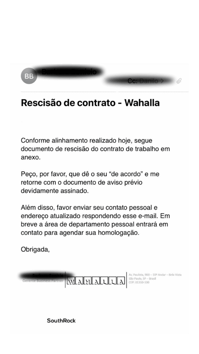 Foi também em 31 de outubro que a SouthRock entrou com o pedido de recuperação judicial, ou seja, no dia dos desligamentos. A empresa de Recursos Humanos, responsável pela comunicação com a equipe, a Wahalla Participações Ltda, é composta pelos três sócios da SouthRock, conforme consta nas informações de cadastro: Fabio David Rohr, Antonio José Rocheta de Sousa Neves e Kenneth Steven Pope.
