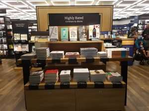 O primeiro mobiliário que recebe os clientes, assim como no site, abriga os produtos melhor avaliados pelos clientes, ou seja, aqueles com pelo menos 4,8 estrelas. É interessante notar que os livros aqui exibidos não são os best-sellers tradicionais que um cliente encontraria em uma livraria.