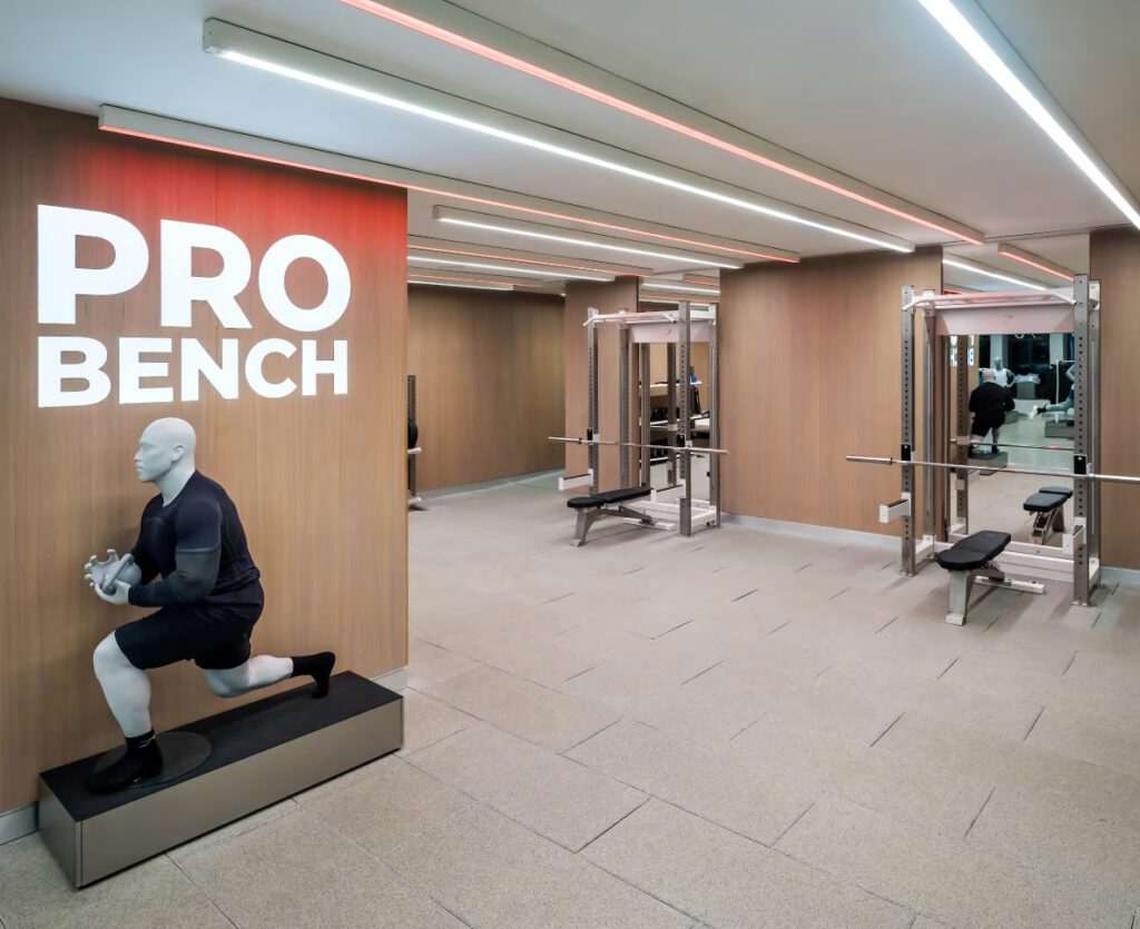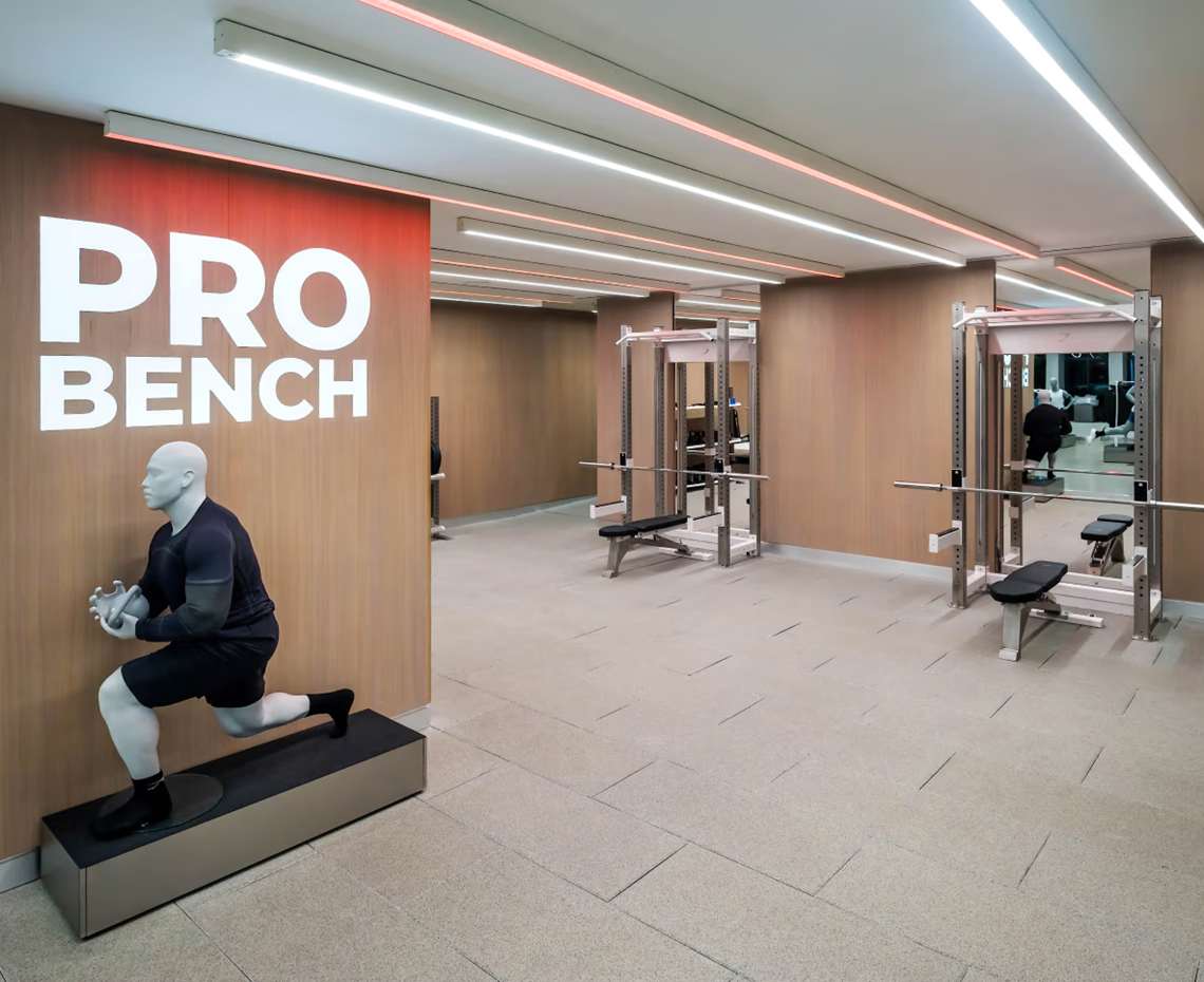 O espaço prioriza o condicionamento físico com uma academia completa, vestiários sem gênero com comodidades premium, como secadores de cabelo Dyson, e áreas de varejo adaptáveis. Piso de academia, racks retráteis e expositores conversíveis transformam grande parte do espaço de varejo em uma área de treinamento funcional.
