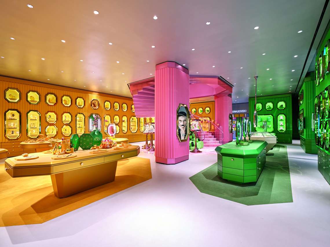 No centro do andar térreo, uma grande escadaria rosa em forma de octógono leva os clientes ao andar superior. É emoldurado por oito vitrines octogonais contendo quadros que retratam episódios dos 128 anos de história da marca austríaca – desde o seu nascimento nos Alpes tiroleses e os primórdios da alta costura até os dias atuais.