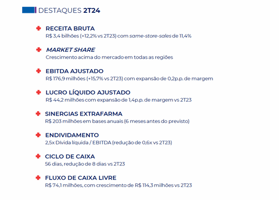 A empresa reforçou também seu posicionamento como hub de saúde, com crescimento de 49% nos atendimentos da clínica farma, além da ampliação da oferta de exames rápidos.