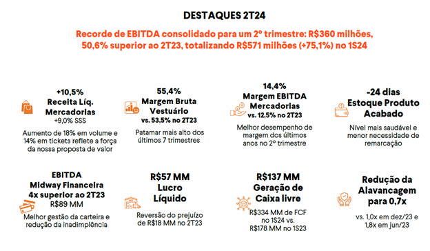 Além disso, o Ebitda da Midway (operação financeira da empresa) quadruplicou, alcançando R$ 89,1 milhões, refletindo uma melhor gestão da carteira e redução da inadimplência.