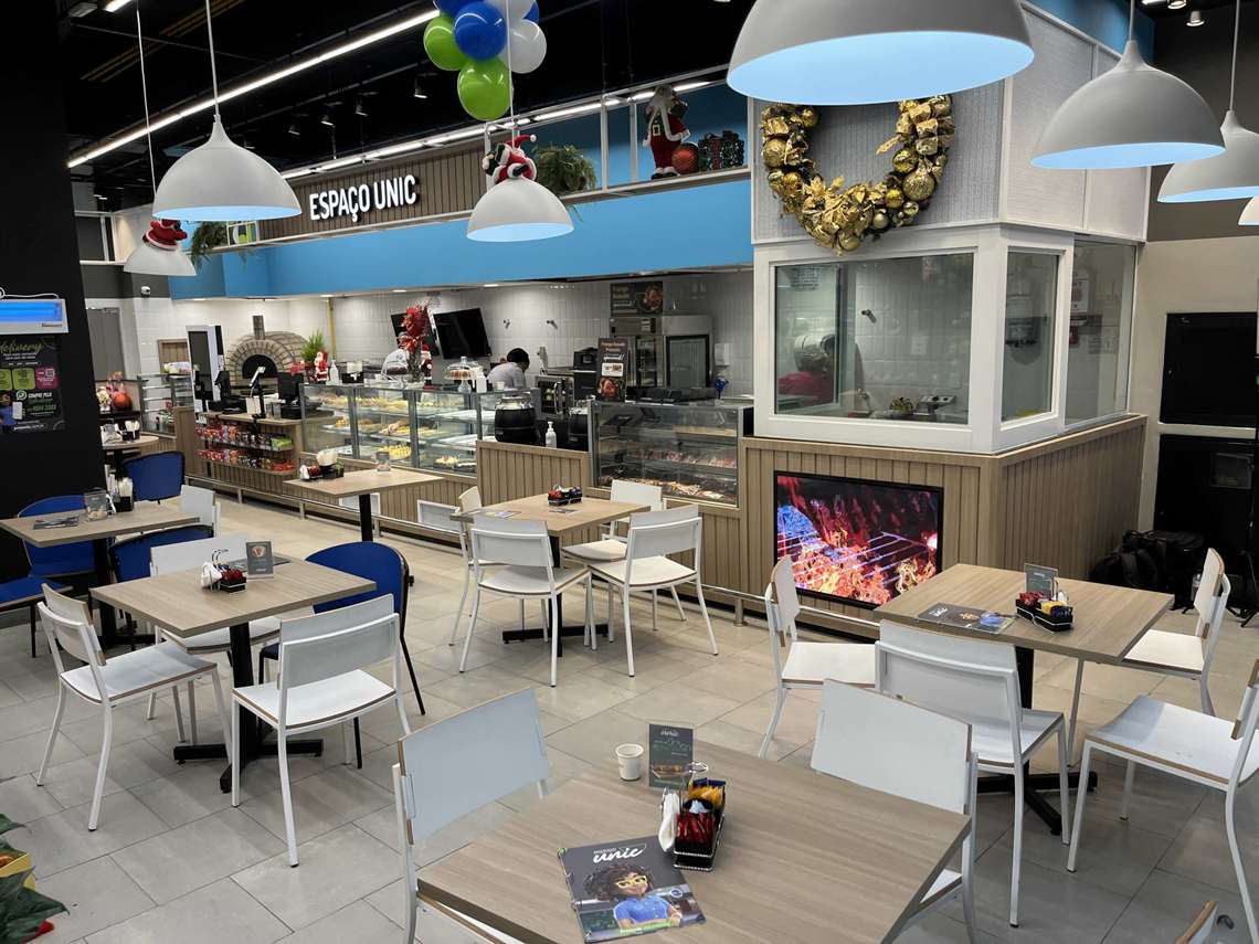 O Espaço Unic oferece opções de café da manhã, almoço e jantar e alimentos para consumo imediato. O pagamento pode ser feito no caixa do restaurante, dispensando a necessidade de passar pelo caixa do supermercado, caso o cliente queira fazer apenas uma refeição.