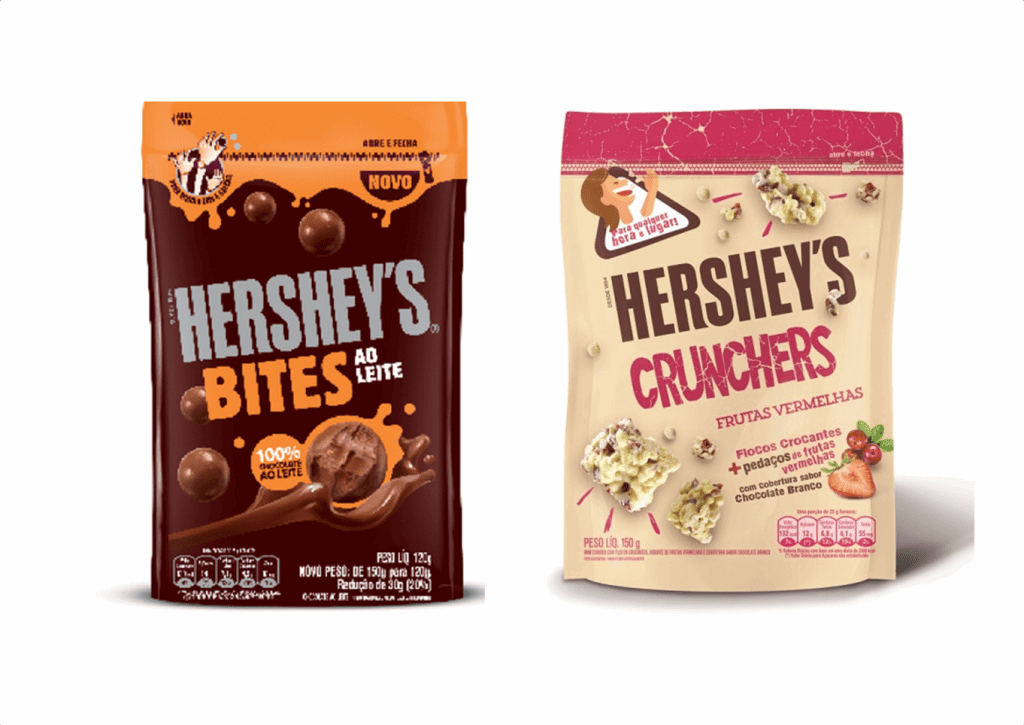 Os Hershey’s Crunchers já são sucesso nos Estados Unidos e chegam ao mercado com fórmulas adaptadas para atender ao sabor dos brasileiros e em porções de 120g. São flocos crocantes com amendoim e cobertura sabor chocolate ao leite ou com pedaços de frutas vermelhas, flocos crocantes e cobertura sabor chocolate branco. Os Hershey’s Bites, antes disponíveis apenas em mercado teste, são chocolates da marca em formato de bolinhas, sem casca de açúcar, e nas versões Ao Leite ou Cookies’n’Creme com 120g. Os produtos vêm em embalagens do tipo “abre e fecha” e são ideais para consumo a qualquer hora e em qualquer lugar. Com estes lançamentos a companhia expande seu portfólio de snacks, antes composto por Hershey’s Mais Minis.