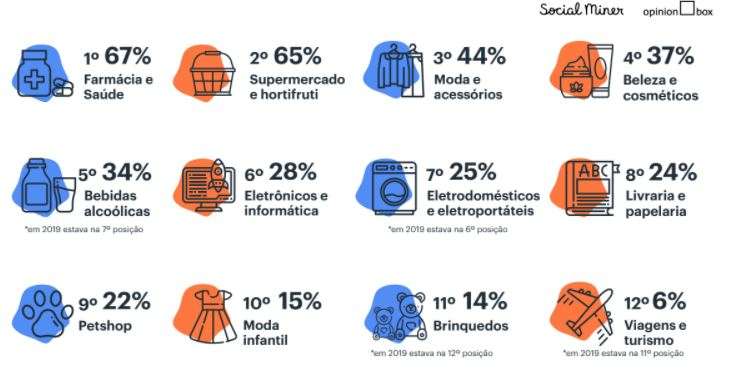 Muitos segmentos, já populares entre os consumidores, mantiveram suas posições entre os mais vendidos durante a quarentena. É o caso das Farmácias e Supermercados. No entanto, o levantamento destaca neste ranking as categorias de Bebidas Alcoólicas e Brinquedos que, uma vez voltadas para o lazer, cresceram no interesse do público, segundo a Social Miner.