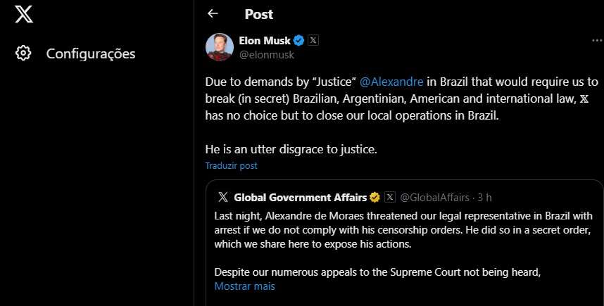 A empresa culpou Alexandre de Moraes, ministro do STF, pela decisão. Segundo a postagem, o ministro teria ameaçado prender o representante legal do X no Brasil.