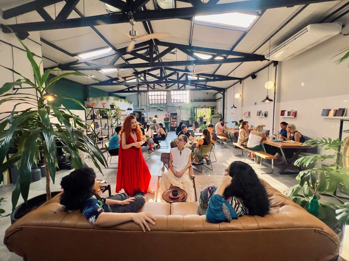 Durante o funcionamento regular, as mesas espaçosas e confortáveis agrupam amigos ou se transformam em local de trabalho para quem busca o coworking como opção no dia a dia. A estante cheia de livros conduz o cliente a um espaço charmoso de leitura e conversa. Também vira o cenário de palestras e workshops sobre temas variados. O salão é o palco perfeito para saraus, música e poesia.