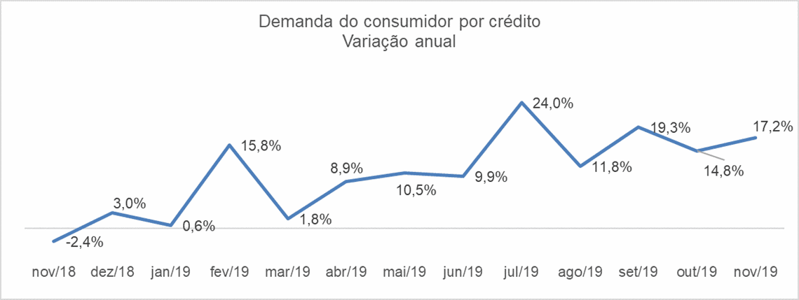 Os consumidores estão voltando a buscar crédito, sendo este o principal fator de incentivo da economia brasileira em 2019, principalmente devido às quedas sequenciais dos juros nos últimos meses. De acordo com a Serasa Experian, seu Indicador de Demanda do Consumidor por Crédito cresceu 17,2% em volume de solicitações de crédito em novembro.