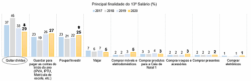 Mais consumidores vão guardar ou investir o 13° salário em 2020, de acordo com pesquisa da Boa Vista feita com cerca de 600 consumidores, em todo o Brasil. De acordo com o estudo, 27% responderam que irão guardar o benefício para o pagamento de contas do início de 2021, como IPTU e IPVA, contra 26% em 2019. Já os que pretendem investir o dinheiro são 25% esse ano, contra 22% em 2019. Entre os entrevistados, 69% dos entrevistados afirmaram ter direito ao benefício.