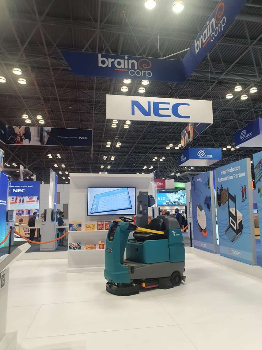 Uma grande atração da feira é o grande robô autônomo da Brain Corp. Ao mesmo tempo em percorre a loja fazendo um inventário do estoque por meio de câmeras embarcadas, ele promove uma limpeza geral do piso. É o uso da tecnologia para facilitar a vida dos varejistas em vários aspectos e ao mesmo tempo.