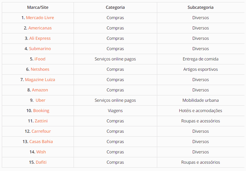 O líder desta edição foi o marketplace argentino Mercado Livre, tanto em quantidade de visitas como em número de pedidos realizados ao longo de todo o ano de 2019. O segundo colocado foi a Americanas.com.