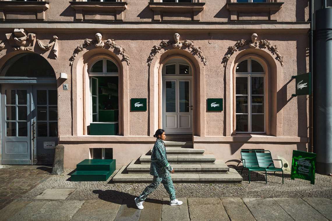 O primeiro Le Café Lacoste foi inaugurado em Berlim, em um espaço que mistura o design clássico de interiores parisienses com um estilo urbano e industrial. Com móveis inspirados nos parques de Paris e elementos típicos da cidade, como xadrez e revistas francesas, o café recria a atmosfera dos jardins parisienses. O cardápio inclui especialidades como croissants, pain au chocolat e cafés artesanais, em colaboração com especialistas locais de café.