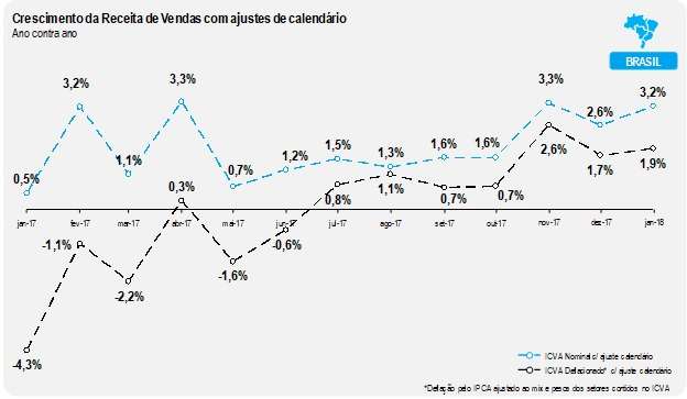 O desempenho total do mês de janeiro foi prejudicado pelo calendário, principalmente pelo feriado de confraternização universal que caiu em uma segunda-feira, enquanto que em 2017 o dia 1º de janeiro foi no domingo – tradicionalmente o dia da semana de menor movimento do varejo.