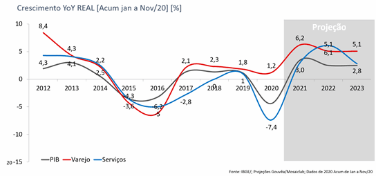 Nossas projeções para os anos de 2021, 2022, 2023 mostram que o varejo deverá se manter resiliente e continuar crescendo acima do PIB na ordem de dois a três pontos porcentuais, como indicado no gráfico acima, enquanto que os serviços devem apresentar uma retomada gradual. Com o aumento do número de pessoas vacinadas e maior circulação de pessoas nas cidades, estimamos um início de recuperação em 2021 (mais acelerado a partir do segundo trimestre), uma forte recuperação do terreno perdido em 2022 e um retorno aos patamares históricos de crescimento em 2023.