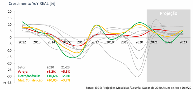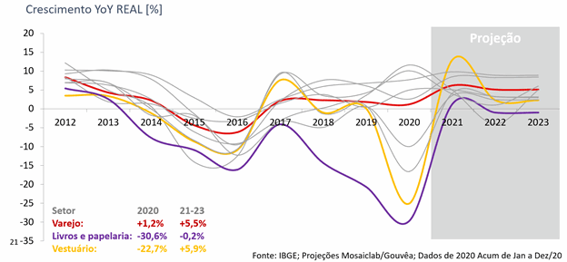 Na sequência, iremos analisar cada um dos segmentos de consumo e varejo, seu desemprenho em 2020 e nossa projeção até 2023.
