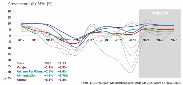 Alimentos Dentro do Lar deve crescer um pouco abaixo da média do varejo, com 3,9% de expansão ao ano, Artigos de Uso Pessoal e Doméstico deve retomar seu crescimento acima da média, com 8,4% ao ano, e o setor de Farmácias, que já vinha crescendo forte, foi ainda mais beneficiado pela pandemia e deve manter seu ritmo de crescimento acelerado com média anual de 9,2%.