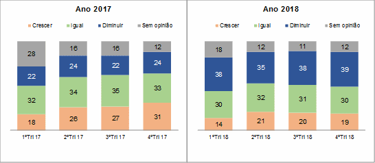 Na comparação com os respondentes do 4º Tri de 2017, cresceu de 24% para 39% o percentual de empresas que preveem um endividamento menor em 2019. 30% delas declararam, por sua vez, que estarão com dívidas iguais às de 2018, e 19% mais endividadas agora. A tabela contém os detalhes.