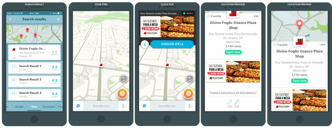 “Dentro da plataforma, ativamos quatro tipos de anúncios: busca patrocinada, com a marca em destaque na página inicial do aplicativo assim que o usuário procurar um local; takeover, um formato mais tradicional que surge na tela do motorista quando parado e que é configurado para aparecer ao público-alvo; pin, uma marcação do estabelecimento no mapa do usuário, como um outdoor digital; e arrow, que são as setas para os locais próximos exibidas ao abrir o aplicativo”, explicou Michelle.