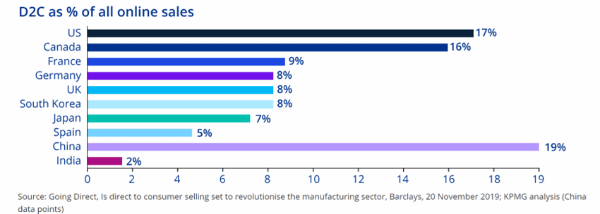 O gráfico acima mostra o quanto de espaço existe para as marcas irem ao DTC no canal online. Esses números não estão disponíveis no Brasil ainda, mas, pelas nossas projeções, teríamos algo como India e Espanha em termos de representatividade. Ou seja, se na China a cada 5 compras realizadas online uma é DTC e nos EUA 1 a cada 6, sem dúvida, esse é um canal a ser priorizado por aqui dado ao potencial, custos de implantação e menor fricção com os canais tradicionais.
