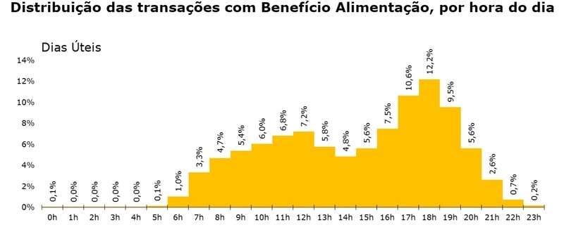 Os dados são do levantamento “Perfil dos Gastos com Mercado por Período e Horário”, realizado pela Alelo em parceria com a Fundação Instituto de Pesquisas Econômicas (Fipe), que aponta que apenas 27% dos trabalhadores fazem suas compras pela manhã (06:00 às 12:00). Em dias úteis, de segunda a sexta, a maior concentração de transações ocorre em dois momentos: por volta das 12h (7,2% das transações) e das 18h (12,2%). Somando o pico de transações por horário, o período entre 16h e 19h, durante a semana, concentra 39,8% das transações com o benefício alimentação em supermercados.