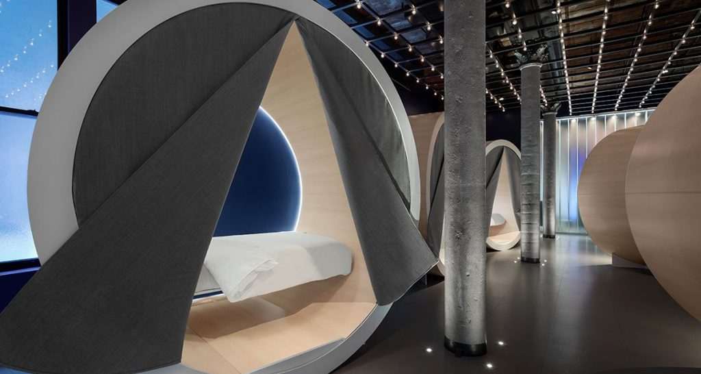 Pense em uma experiência lúdica com mini casinhas, teto estrelado, espaço sideral, fronhas com carinhas lúdicas, uma cortina para fechar a casinha e manter a privacidade, pijama disponível, bebidas e amenidades e, além de, é claro, poder tirar um belo cochilo. Uma soneca de 45 minutos, pelo custo de U$$25. E, saiba que há fila de espera em determinados horários.
