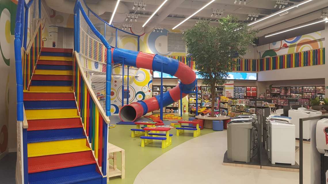 Mais ao fundo da loja, uma região é destinada as crianças. No local, elas podem brincar com jogos mais lúdicos ou com alguns aparelhos mais digitais. O ambiente também conta com um grande escorredor para elas aproveitarem.