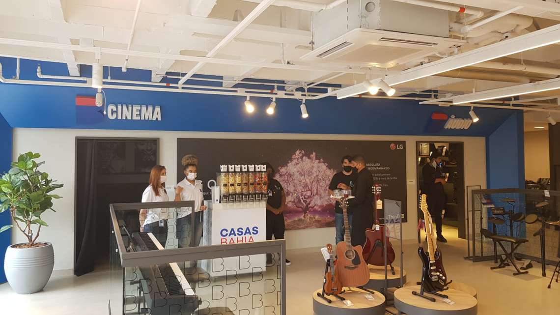 Ainda no primeiro andar da megaloja da Casas Bahia, na parte de televisores, existe um pequeno cinema, assim como um balcão com tipos de pipoca para se servir e assistir à programação. Um pouco mais ao lado fica uma área que funciona como estúdio para lives e um exemplo do que seria uma casa totalmente conectada.
