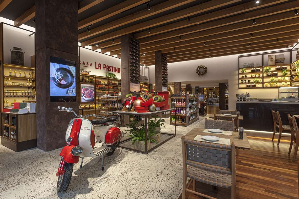 Com a proposta de fugir do formato de supermercado, o Empório da La Pastina possui um trabalho de visual merchandising que tem como foco criar uma atmosfera aconchegante, capaz de orientar o consumidor e destacar os diferenciais de cada produto. A área mescla a oferta de itens de prateleira com os serviços assistido para pães, frios e queijos frescos, além da rotisseria.