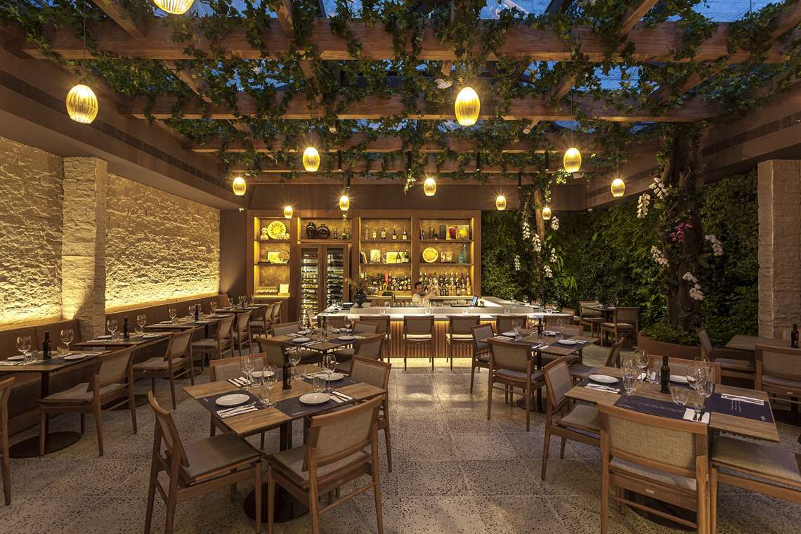 O projeto do salão do restaurante e bar explora elementos naturais, com paredes de pedras inspiradas na região do Mediterrâneo – origem da família La Pastina. A irregularidade da superfície das paredes também age para abafar a reverberação do som, melhorando o conforto acústico do espaço. Além disso, uma grande parede verde ajuda a proporcionar frescor e textura ao ambiente.