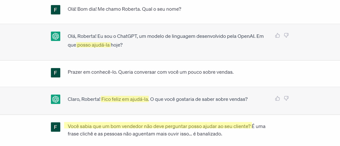 E o ChatGPT falhou nesse teste. Ficou novamente preso aos conhecimentos óbvios e padronizados, sem considerar o momento do relacionamento e a conexão com o cliente como fatores centrais. Além disso, trouxe novamente a frase “em que posso ajudá-lo hoje?”, sendo que eu já havia explicado que o termo “ajudar” deveria ser evitado.