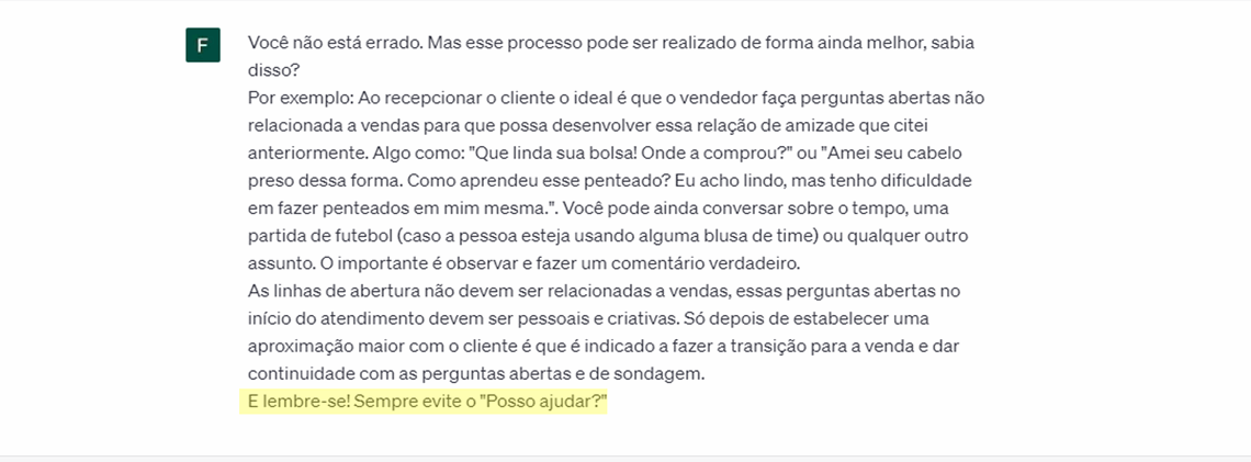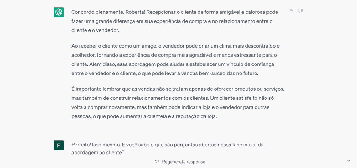 Assim, me fiz ainda mais clara, explicando que esse relacionamento inicial era importante e que era necessário receber o cliente, como quem recebe um amigo na loja. A IA rapidamente concordou comigo e novamente falou um pouco mais sobre o tema, de forma coerente e demonstrando o seu conhecimento sobre o tema.