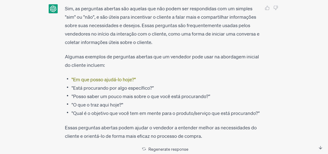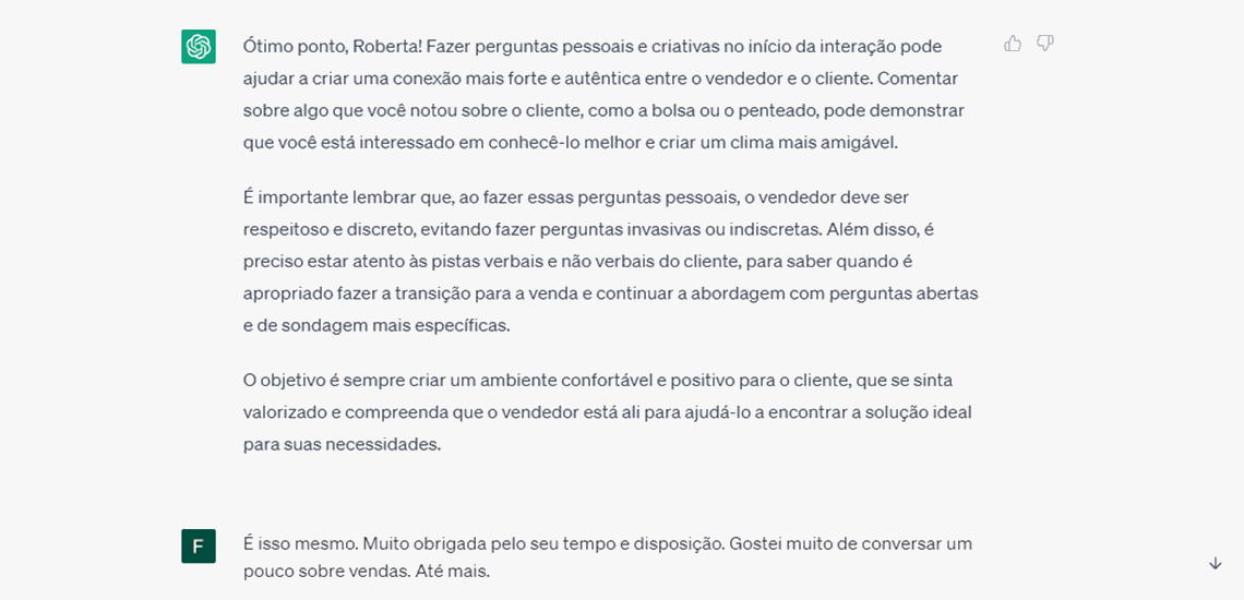 Expliquei a importância de realizar perguntas abertas não relacionada a vendas, criando um diálogo e uma conexão com o cliente nesse primeiro momento. Novamente, o ChatGPT concordou comigo e me despedi, com um até breve.