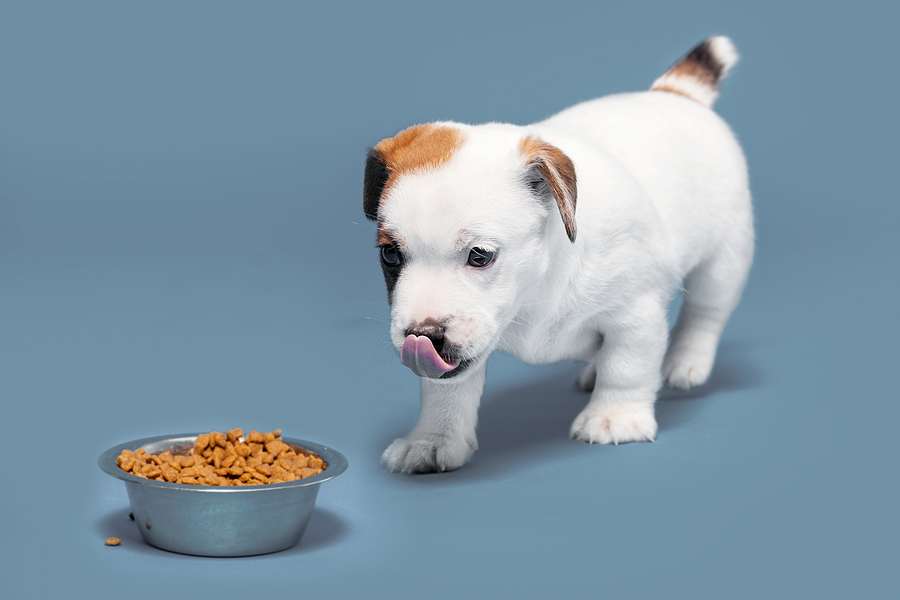 Puppy eats dog food from a bowl. Little dog eating Studio Shot