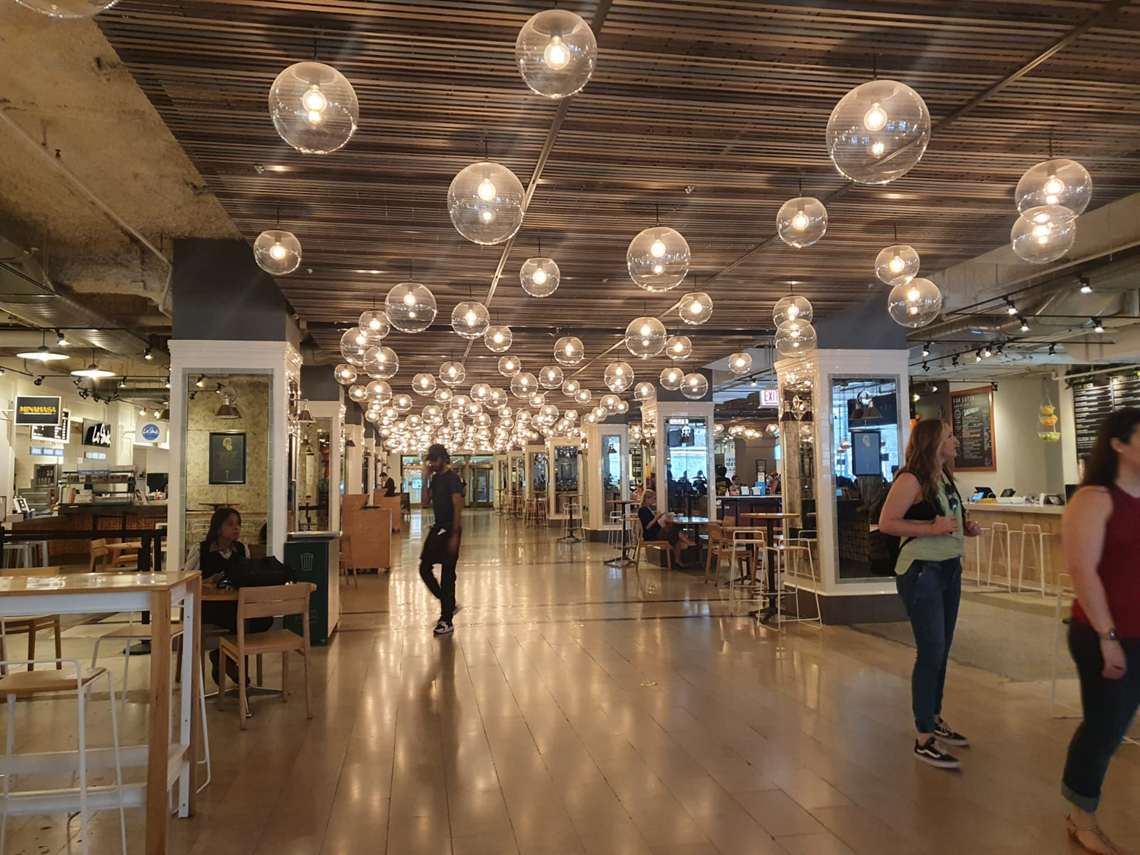 Os food courts, praças de alimentação que abrigam diversos bares e restaurantes sob um mesmo teto, chamam a atenção na arquitetura da cidade. O Time Out Market ocupa desde 2019 um prédio de 4.600 m² no antigo bairro de armazéns Fulton Market, hoje uma área badalada de Chicago. Os estabelecimentos reunidos ali têm a curadoria editorial da revista que dá nome ao espaço. “Estamos dando vida às páginas da nossa revista da maneira mais saborosa possível”, define a empresa, que também tem unidades em Boston, Dubai, Lisboa, Miami, Montreal, Nova York e Praga.