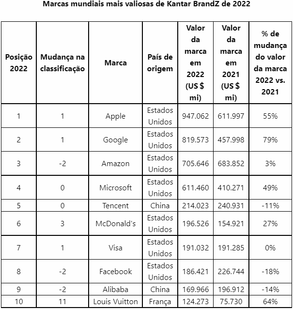 Com um valor de marca de US$ 947,1 bilhões, a Apple está no topo da classificação das Marcas mundiais mais valiosas do Kantar BrandZ de 2022 e a caminho de tornar-se a primeira marca de trilhões de dólares. A gigante de tecnologia se destaca por seu alto grau de diferenciação e diversificação continuada, englobando hardware, software e portfólio de serviços.
