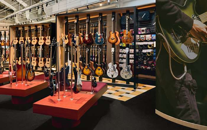 Os clientes podem interagir com instrumentos e equipamentos em ambientes ao vivo, promovendo uma experiência de compra prática e memorável.