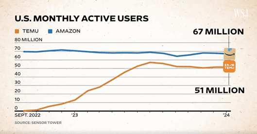 Outra estratégia é apostar no modelo member get member, em que os usuários podem desbloquear ofertas ou ser remunerados ao trazer novos clientes, impulsionando não apenas a aquisição de consumidores, mas incentivando a lealdade e o engajamento contínuo dos já existentes. Mesmo com um investimento tão alto, o custo de aquisição de clientes da Temu é menor, se comparado aos custos dos seus competidores diretos. Estimativas indicam que a empresa estaria próxima do número de usuários da Amazon nos EUA.