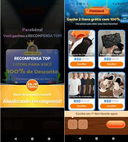 A Temu também utiliza técnicas de gamificação para tornar a experiência de compra mais envolvente. Por exemplo, a roleta de descontos permite aos usuários ganhar prêmios e descontos adicionais, incentivando mais compras. O cashback também é uma ferramenta poderosa para fidelizar clientes, oferecendo recompensas tangíveis por suas compras. No Brasil, a empresa adotou a estratégia de oferecer produtos de graça e frete grátis na primeira compra dos usuários, conforme a foto abaixo: