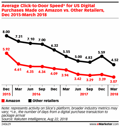 Aliás, a diferença de tempo de entrega entre Amazon e os demais varejistas vem caindo ao longo do tempo, muito em função da aplicação da tecnologia, inteligência artificial, algoritmos e o repensar do papel da lojas no negócio do varejo.