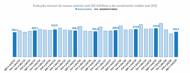 Como demonstrado no gráfico abaixo, a massa salarial no Brasil caiu 9%, de R$ 219,8 bilhões em 2019 para R$ 199,4 bilhões em 2020 no mesmo trimestre comparável, menor patamar desde que a pesquisa PNAD foi implementada no Brasil.