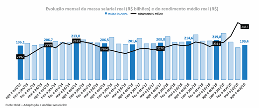 Com uma queda tão expressiva da massa salarial, o conturbado auxílio emergencial aprovado pelo governo foi fundamental para mantermos o consumo no Brasil e para proteger as famílias mais pobres. Entre abril e agosto de 2020, foram aproximadamente R$ 20 bilhões a R$ 25 bilhões injetados mensalmente na massa salarial e, entre setembro e dezembro, algo como R$ 10 bilhões a 15 bilhões mensalmente.