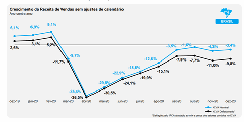 O dados do ICVA da Cielo (Índice Cielo do Varejo Ampliado) apontaram uma importante recuperação no consumo desde o pior momento da crise, em abril de 2020, saindo de uma queda de 36,5% em para uma queda de 10% em dezembro. Vale lembrar que essa é a média de mercado, sendo que alguns segmentos estão crescendo e se beneficiando desse momento, como alimentos dentro do lar, materiais de construção e farmácias, enquanto que outros segmentos seguem com perdas expressivas, como todo o setor de serviços, vestuário e calçados, entre outros.