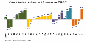 As vendas do “varejo ampliado” (classificação que adiciona ao varejo restrito o atacado e varejo de materiais de construção, veículos, motos, partes e peças) apontam que dezembro de 2017, na comparação anual, teve um crescimento real de 6,4%. Um número bastante animador e promissor. Nesta direção, 2018 aponta para os varejistas que, mesmo em crise, alguns estados já estão esboçando crescimento no consumo, descolando da própria realidade econômica que se encontram.