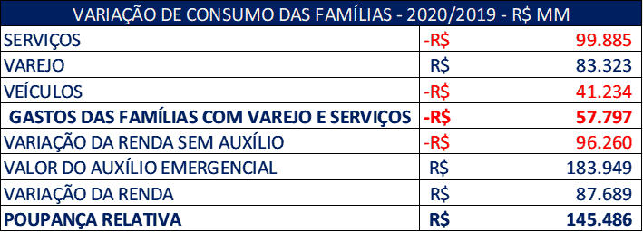 A tabela abaixo mostra uma extrapolação de números com base nas perspectivas de consumo de varejo e serviços derivadas de dados do Instituto Brasileiro de Geografia e Estatística (IBGE). Com base no volume de faturamento de varejo e de serviços dirigidos às famílias (algo como R$ 2,1 trilhões e R$ 0,8 trilhão, respectivamente) e na variação nominal em cada grupo de varejo e serviços em 2020, foi confeccionada a variação de gastos das famílias. Da mesma forma, a variação da renda foi obtida com base nos dados da Pnad Contínua, também divulgada pelo IBGE.