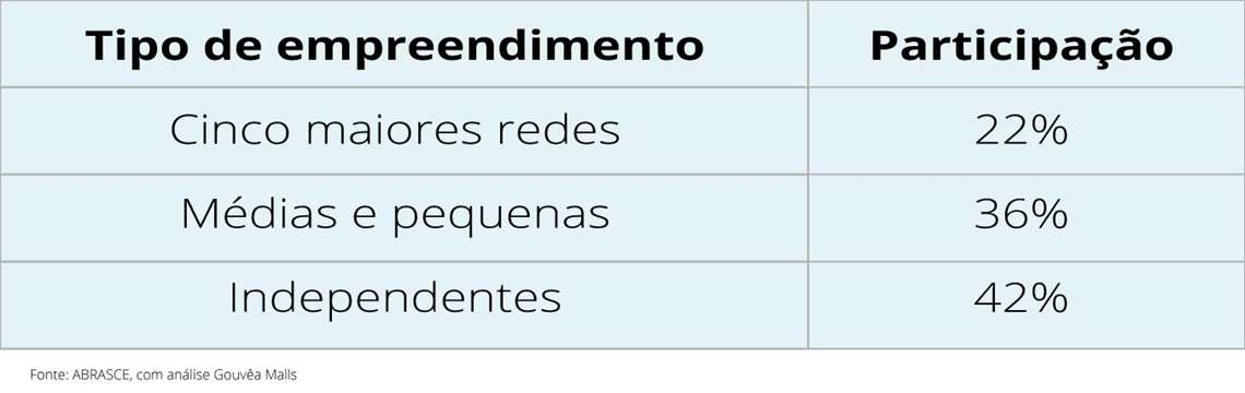 Esse cenário, que evidencia a necessidade das grandes administradoras de reforçar a musculatura para enfrentar os novos tempos, também configura um importante desafio para o segmento dos shopping centers independentes, aqueles que não integram rede alguma. Para dar uma ideia mais precisa do que esse grupo representa, basta dizer que a soma de todos os centros comerciais das cinco maiores redes, Aliansce Sonae, brMalls, Ancar, Multiplan e Iguatemi, totaliza 22% dos shopping centers brasileiros. Já os shoppings independentes respondem por 42% dos empreendimentos espalhados pelo País.