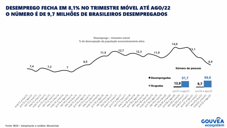 Como pode ser observado no quadro abaixo, depois de termos atingido o pico do nível de desemprego no 3º trimestre de 2021, vivemos um processo de recuperação. O nível atual, de 8,9%, é significativamente melhor em relação ao mesmo período do ano anterior e com tendência de continuidade de redução nos próximos trimestres.