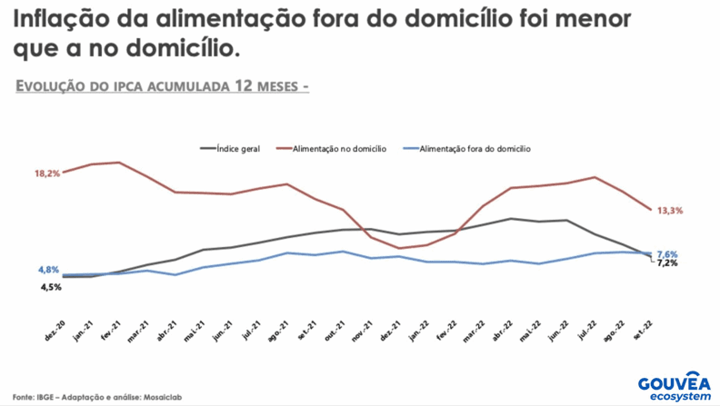 E como se observa, superado o período mais dramático da inflação para o setor de alimentação, no lar e fora do lar, existe uma tendência declinante com perspectiva de continuidade de sua redução no Brasil.