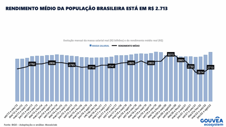 Como se percebe no quadro, a renda real vinha declinante pela combinação do cenário econômico, sanitário e social adversos, os impactos nos salários pagos e a corrosão do seu valor real pela inflação. No último trimestre, iniciou-se um processo de recuperação do rendimento real com forte tendência de permanecer nos próximos trimestres incentivado pela recuperação da economia, redução da inflação e retomada dos investimentos do setor privado. Potencialmente ainda beneficiada por investimentos externos diretos pelas oportunidades que o País oferece.